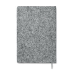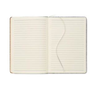 A5 märkmik RPET-vildist ja korgist kaanega. Sisaldab 160 joonelist taaskasutatud paberist lehekülge (80 lehte). Ees elastne pliiatsihoidik, sobiva tooniga elastne kinnituspael ja järjehoidjapael.