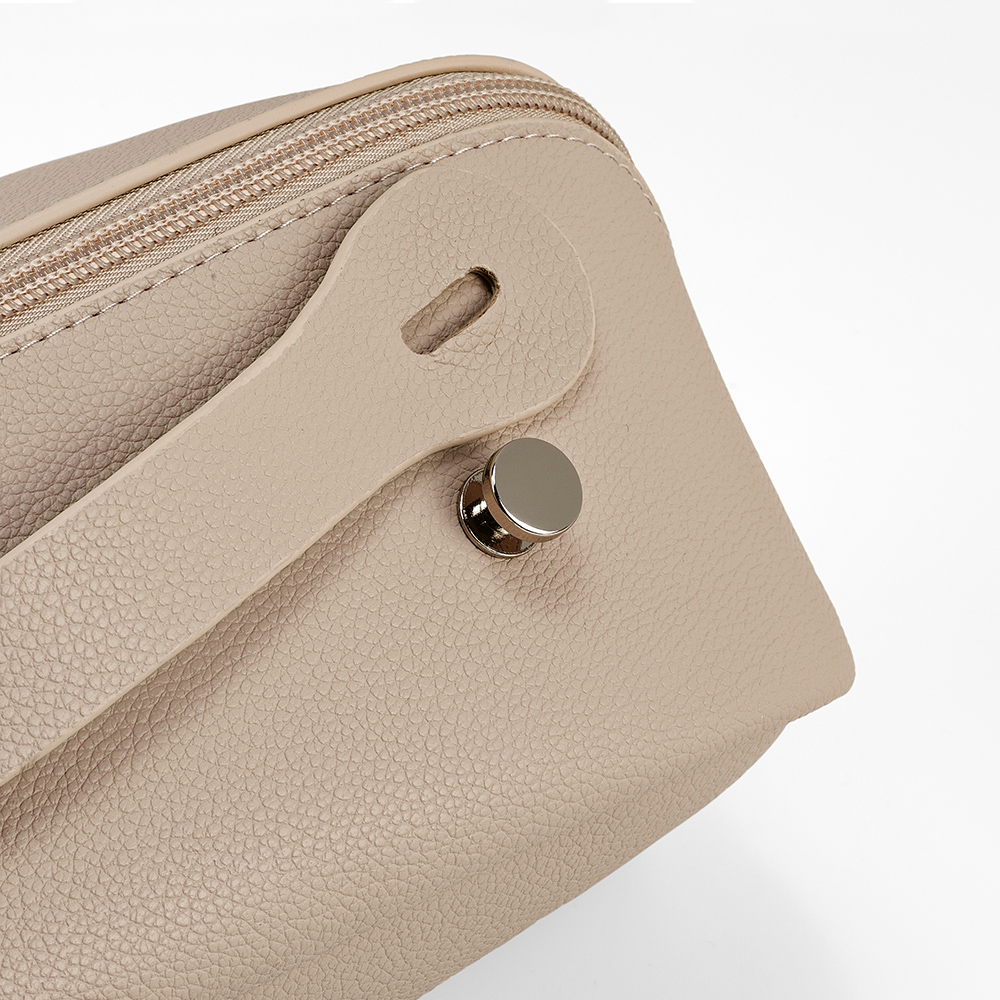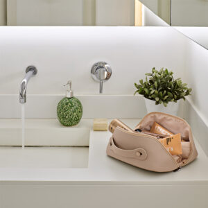 Taaskasutatud nahast kosmeetikakott, mis avab kaks suurt sektsiooni ja väiksema tasku, mis võimaldab lihtsat ligipääsu sisule (3,5 l). Veekindel, vastupidav ja tarnitakse biolagunevas kilepakendis.